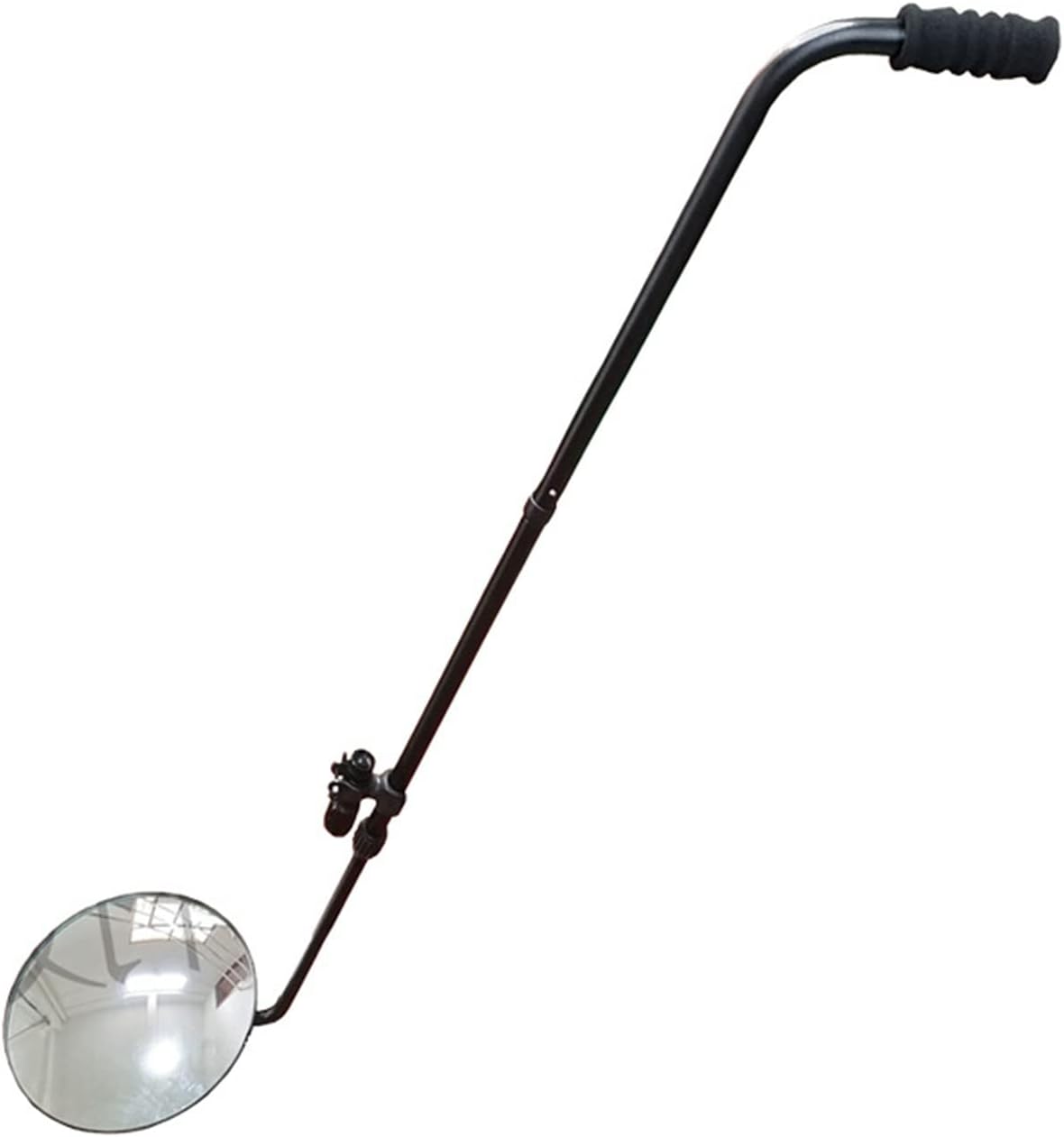 Ergonomic designed security mirror including a galvanized steel handle, super clear scratch-resistant mirror, slip-resistant rubberized PVC hand grip, and telescoping pole.